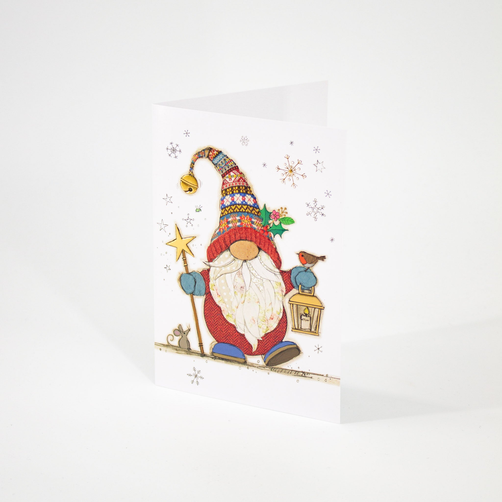 Celebrate the season with this large Christmas card featuring a charming festive gonk holding a lantern. Embossed textures and shimmering gold foil details add a magical touch to this whimsical holiday design.