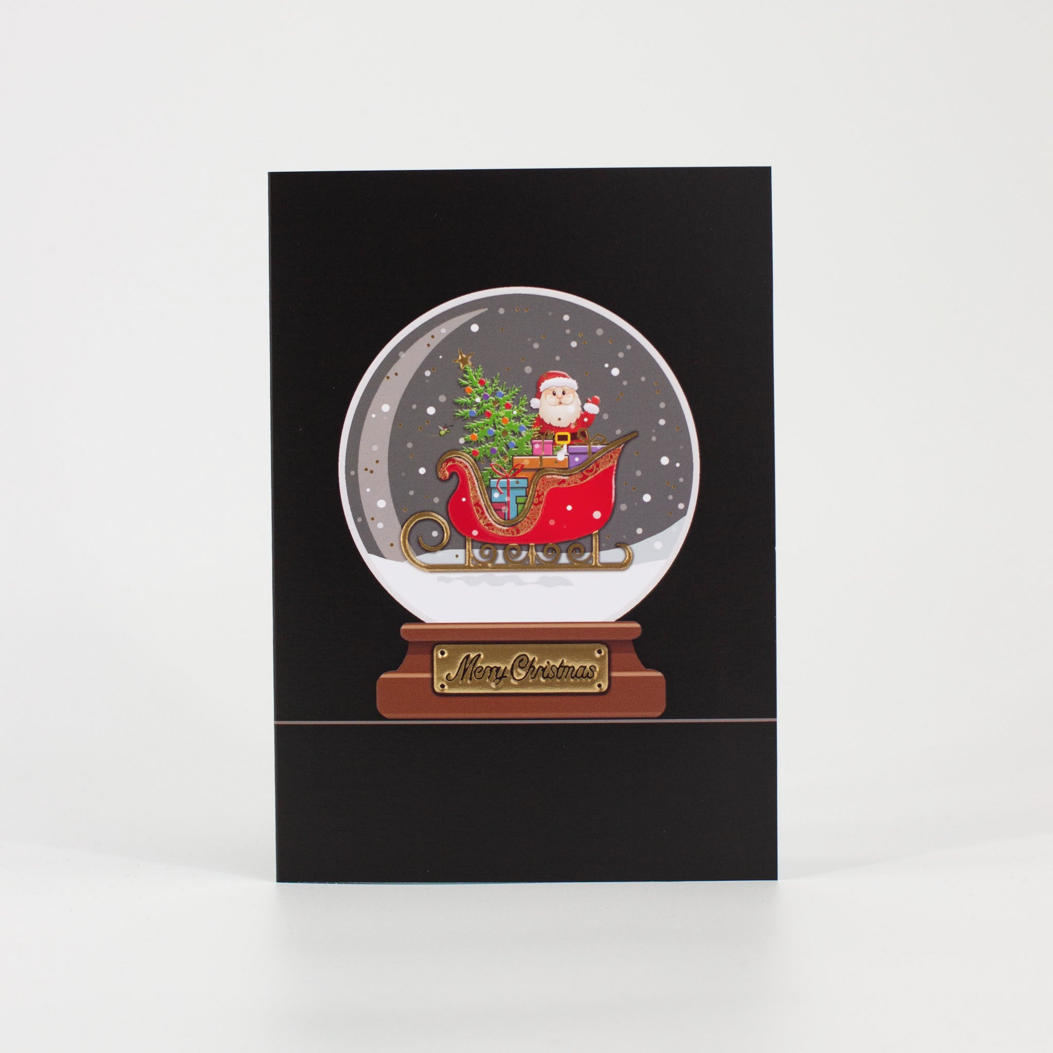 Celebrate the magic of the season with this festive Christmas card featuring Santa inside a beautifully illustrated snow globe. Embossed textures and shimmering gold foil accents add a touch of sparkle to this joyful holiday design.