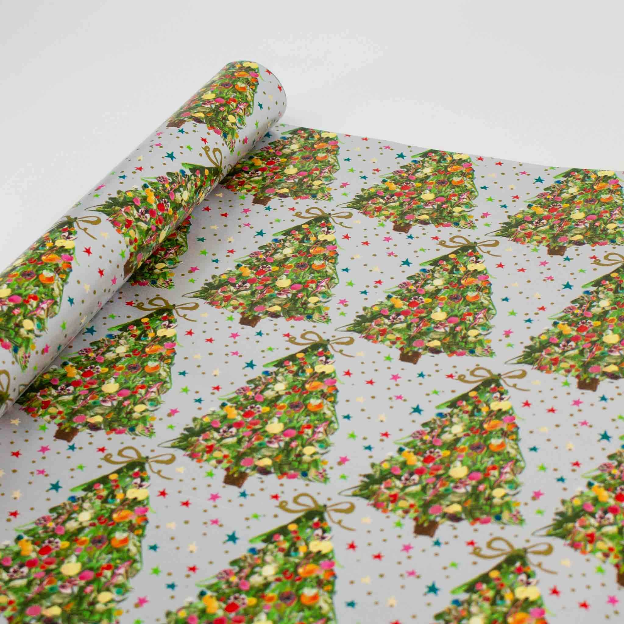 Celebrate the season with this stunning 4-metre roll of gift wrap showcasing intricate green tree motifs. Enhanced with bright star accents on a sleek silver backdrop, this design brings sophistication and festive charm to your Christmas gifts.