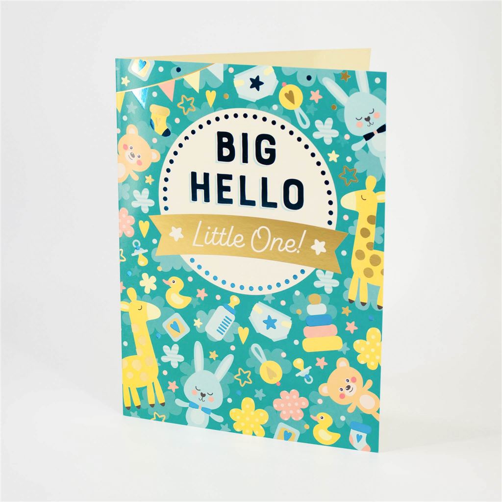 Welcome a little one with this cheerful jumbo baby card, featuring a soft teal background and delicate gold detailing. Its warm and joyful design makes it perfect for celebrating new arrivals with style and love.