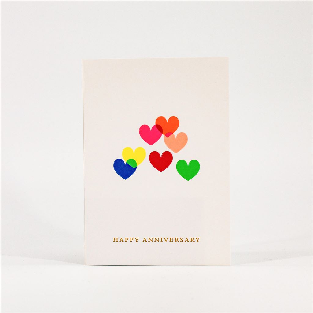 Mark the occasion in style with this premium card featuring a clean white background, playful heart accents, and a simple “Happy Anniversary” message in gold foil. Ideal for couples who appreciate modern elegance.