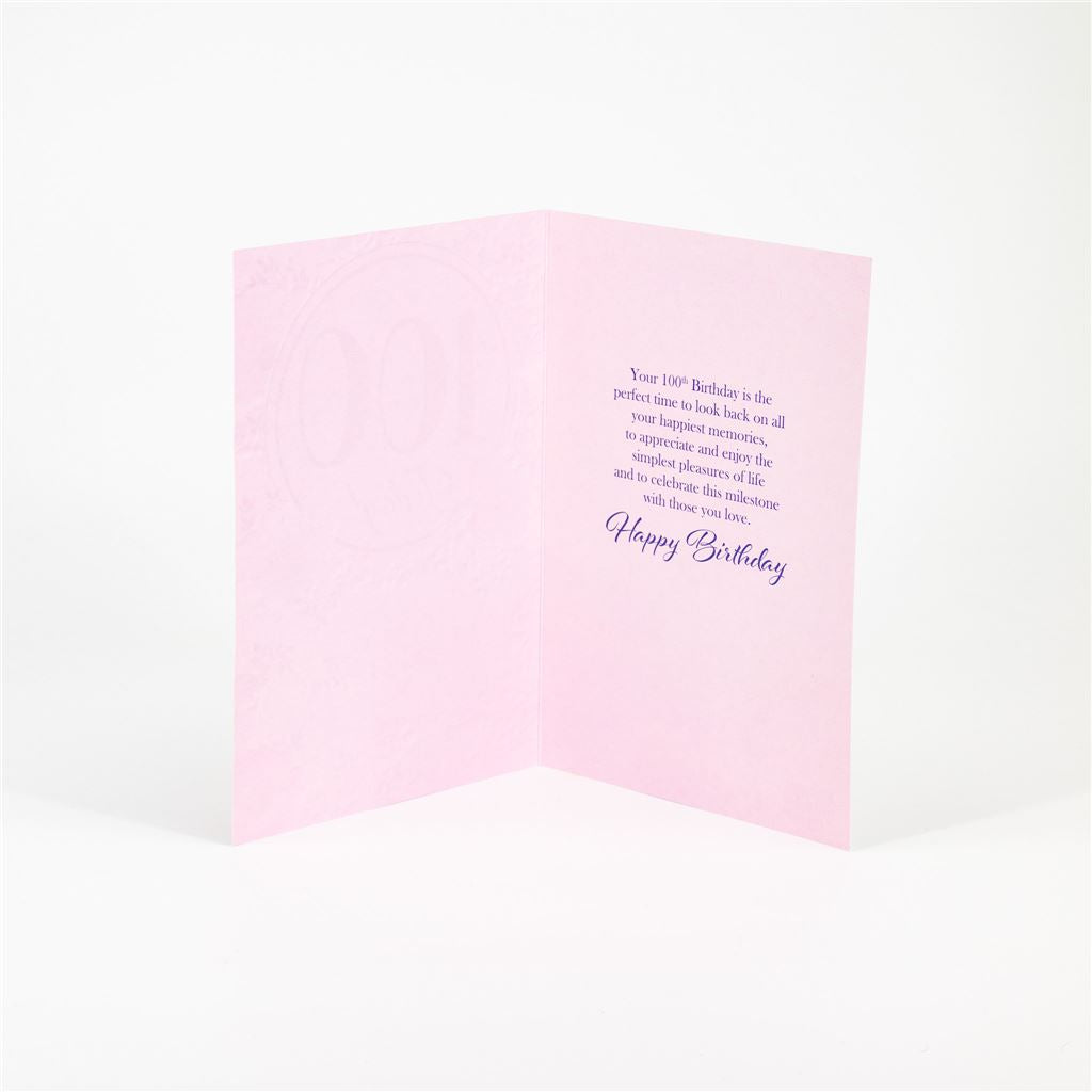 Card Message: Your 100th Birthday is the perfect time to look back on all your happiest memories , to appreciate and enjoy the simplest pleasures of life and to celebrate this milestone with the ones you love. Happy Birthday