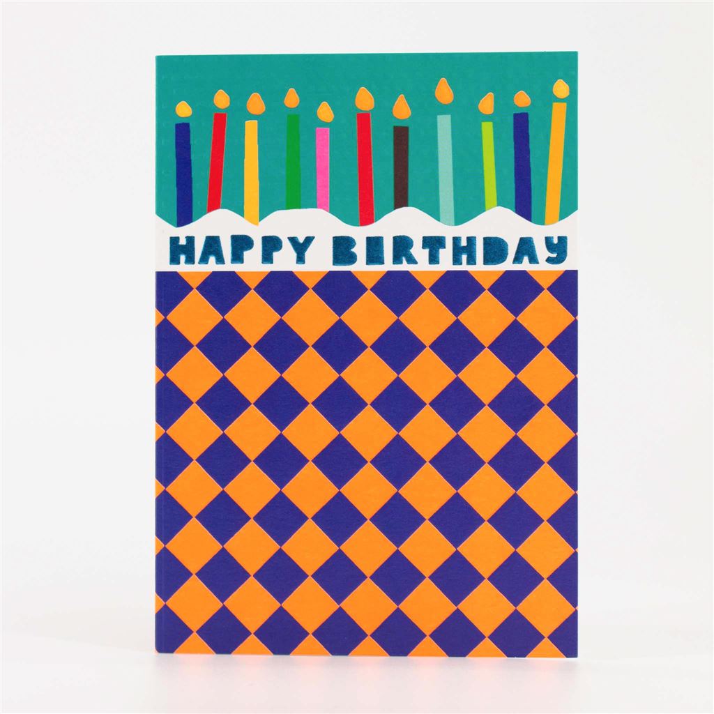 Celebrate in vibrant style with this bold birthday card featuring multicolored candles and a striking orange-and-blue check pattern. Perfect for adding fun and energy to any celebration.