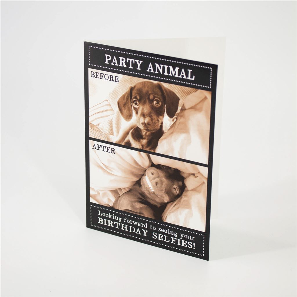 Celebrate in style with this hilarious birthday card featuring a cheeky “Party Animal” theme. The playful before-and-after dog illustration makes it perfect for friends who love a good laugh.