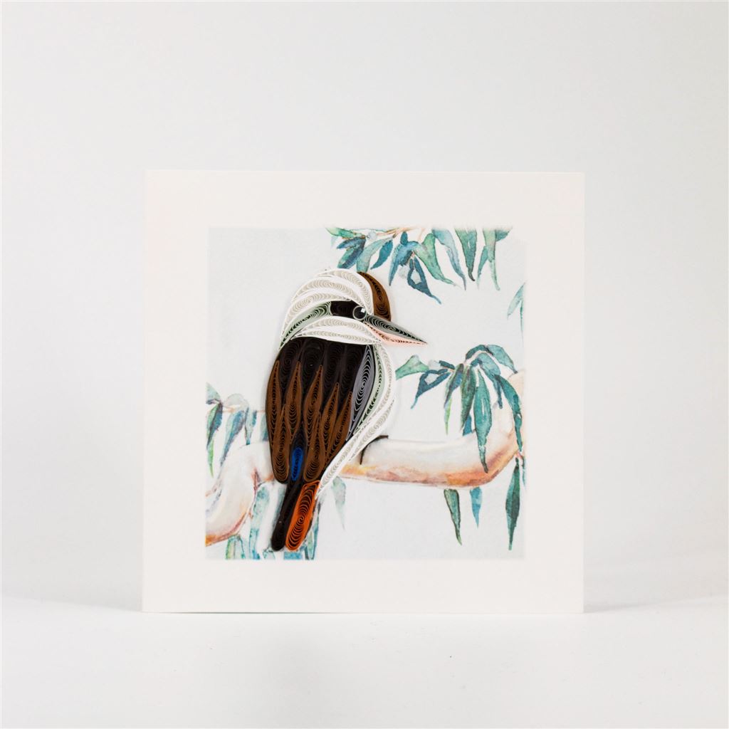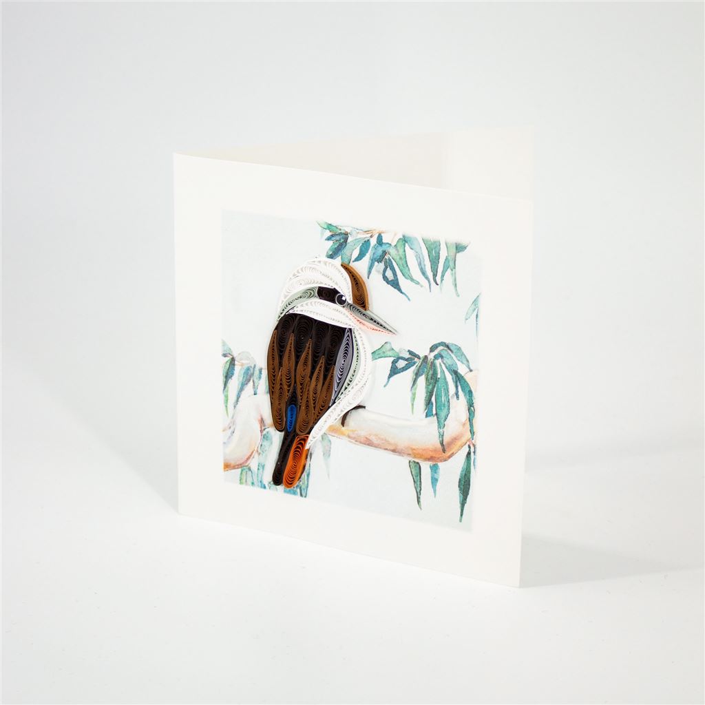Celebrate craftsmanship with this stunning handcrafted card featuring a detailed quilled kookaburra perched on a branch with soft botanical accents. Perfect for birthdays, anniversaries, or heartfelt messages. Blank inside for your personal note.