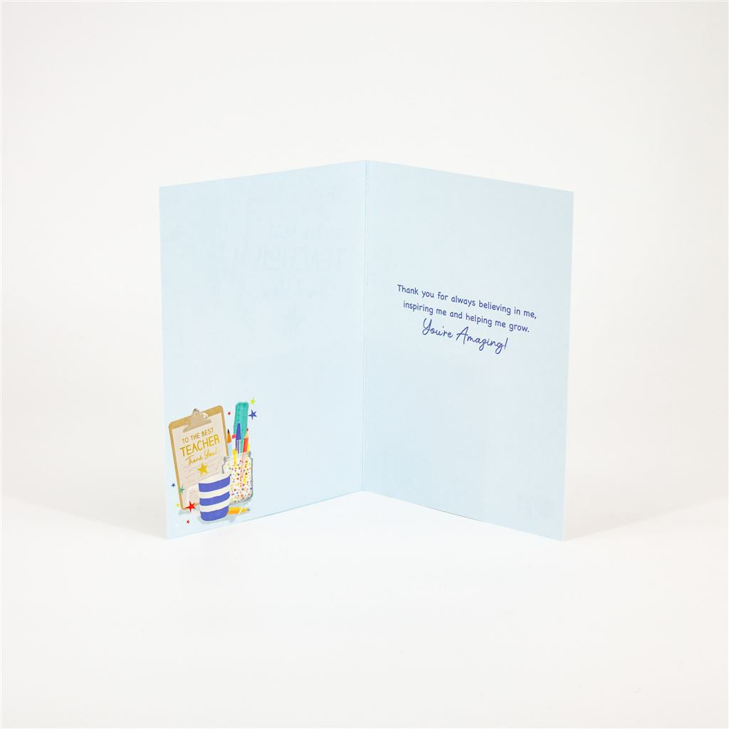 Show your appreciation with this thoughtful thank you card featuring a charming clipboard and pens illustration. A perfect way to express gratitude to teachers with a design that reflects their everyday tools and dedication.