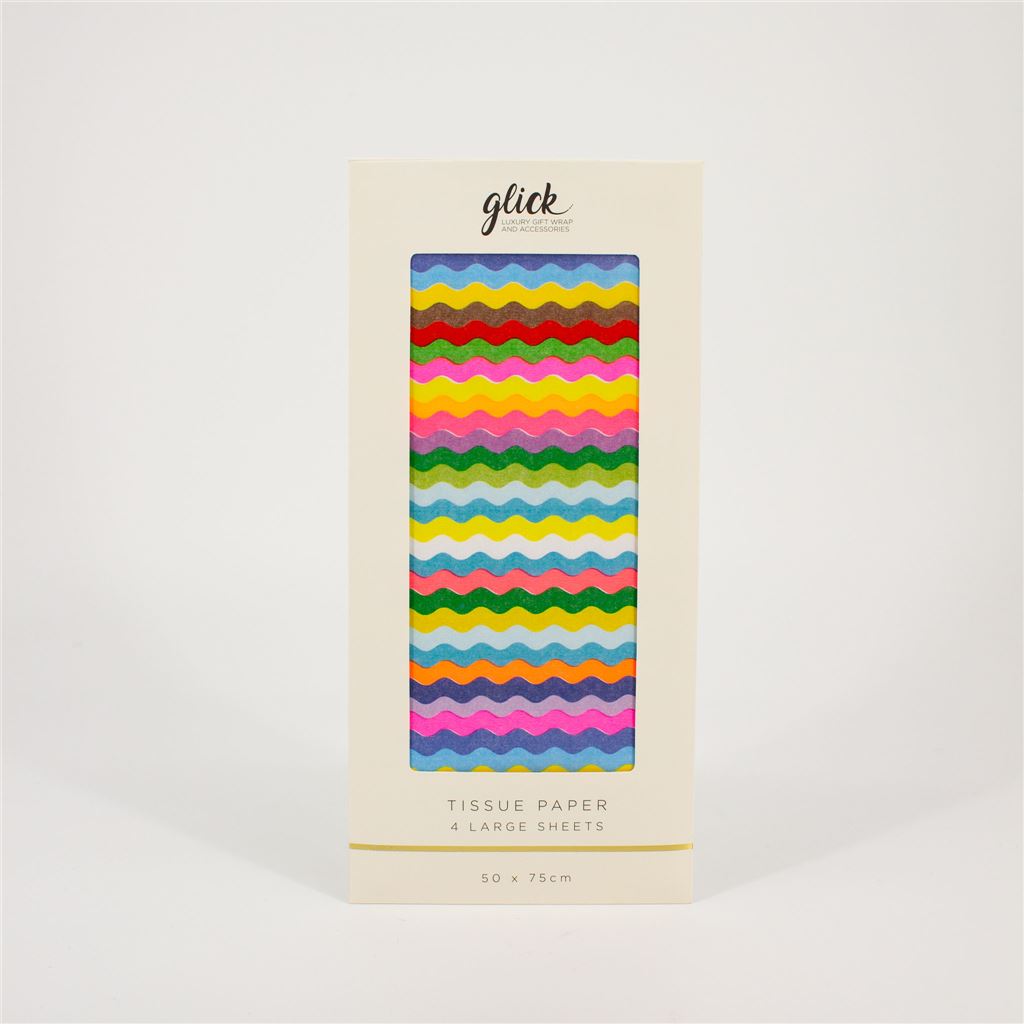 Add a fun and vibrant touch to your gifts with this set of four Ric Rac tissue sheets. Featuring a bold, colourful zigzag pattern, these sheets are perfect for birthdays, parties, and creative projects.