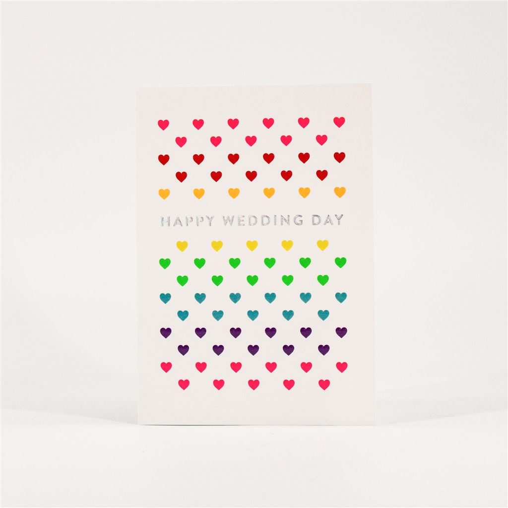 Celebrate love with this joyful white wedding card adorned with bright, colorful hearts. Its cheerful design and elegant “Happy Wedding Day” message make it the perfect way to share warm wishes on a couple’s special day.